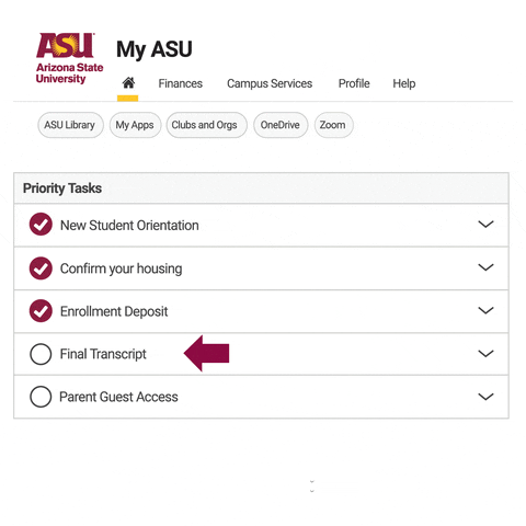 Your student’s first semester at Arizona State University is almost here, and we hope they’re getting as excited as we are. In order for your student to begin their first year at ASU, they’ll need to send us their final transcripts with their final grades and graduation date as soon as possible. If your student recently submitted their transcripts, don’t worry — it may take up to 10 business days for them to arrive and post to My ASU. Official transcripts must be sent directly to ASU’s Admission Services from the issuing institution’s records office either by mail or electronically through a secured transcript service approved by ASU. Note: Your student’s course registration and financial aid (if applicable) may be impacted if we do not receive their transcripts. If you have any follow-up questions about your student’s transcripts or becoming a Sun Devil this fall, connect with your student’s personal admission team member.